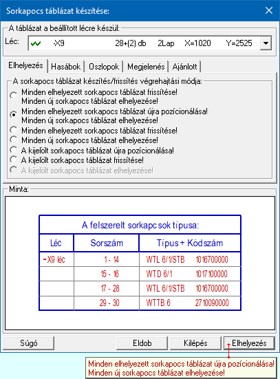- A léchez tartozó sorkapocs táblázat elhelyezet a terven a megjelölt pozícióban.